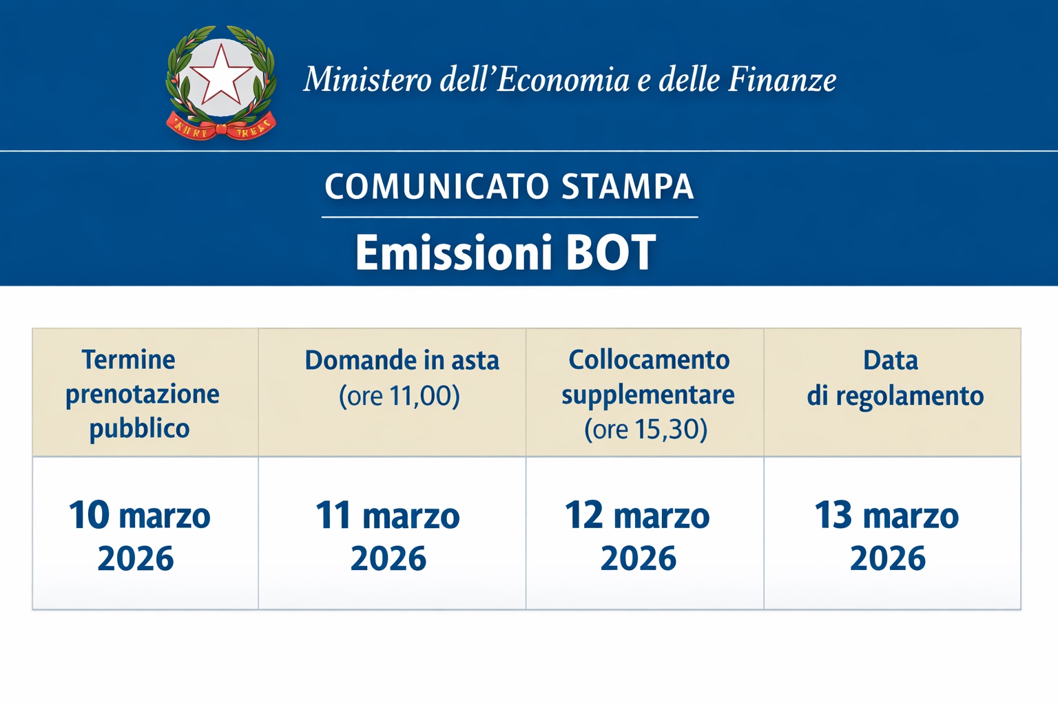 Il Ministero dell'Economia e delle Finanze ha annunciato il 6 marzo 2026 una nuova emissione di BOT annuali (364 giorni).