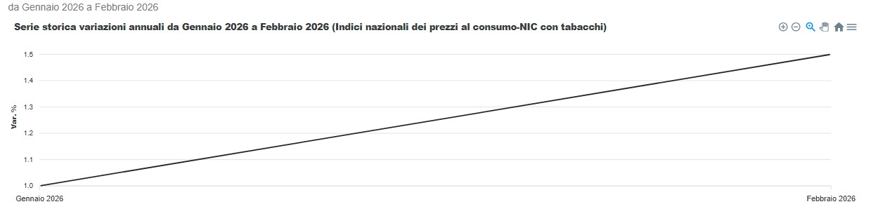 Secondo i dati definitivi diffusi dall’ISTAT, nel mese di febbraio 2026 l’indice nazionale dei prezzi al consumo (NIC) ha registrato un aumento dello +0,7% su base mensile e un incremento tendenziale del +1,5% (in deciso rialzo rispetto al +1,0% di gennaio). La stima preliminare era stata fissata a +1,6%.