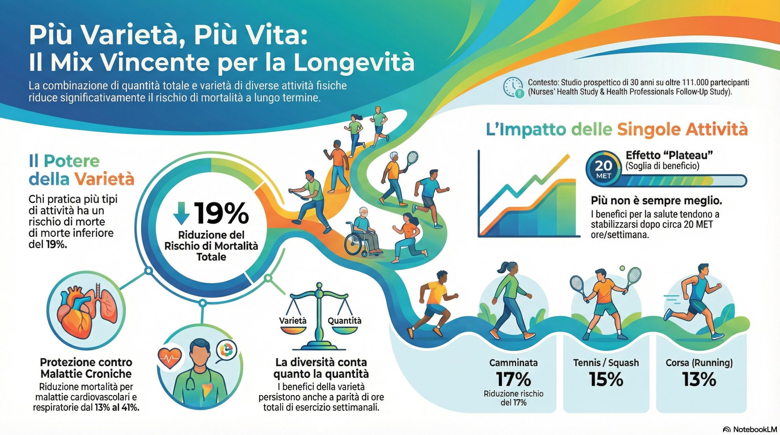 Un monumentale studio pubblicato il 20 gennaio 2026 su BMJ Medicine ha analizzato i dati di due grandi coorti prospettiche – Nurses’ Health Study e Health Professionals Follow-Up Study – coinvolgendo oltre 111.000 partecipanti seguiti per decenni (dal 1986 fino al 2018/2020). I ricercatori della Harvard T.H. Chan School of Public Health hanno dimostrato che non conta solo quanto ci si muove, ma soprattutto quante tipologie diverse di attività fisica si praticano regolarmente.